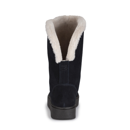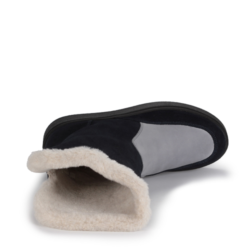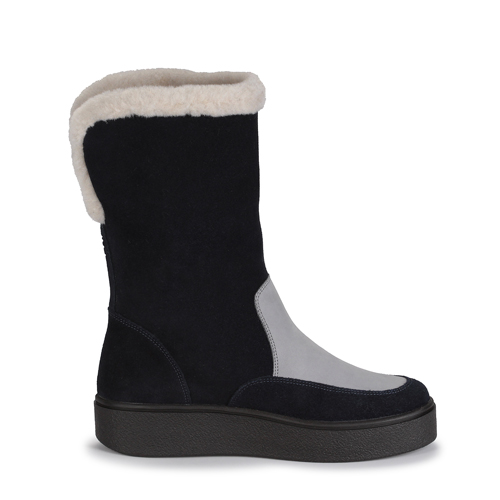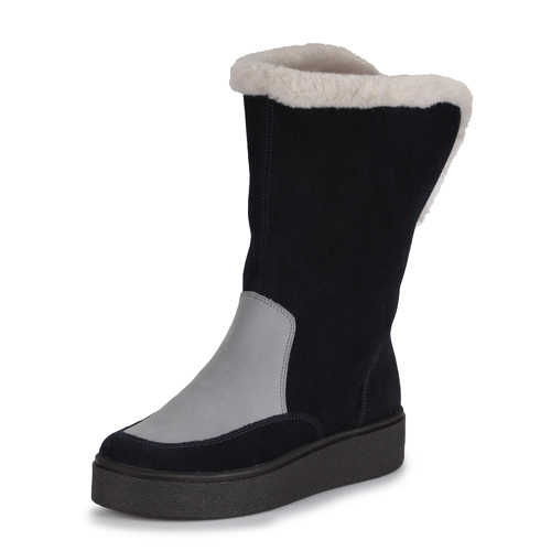 Зимние женские полуспаоги RICONTE в сочетании темно – синего и серого цвета с закругленным носом – незаменимый атрибут такого холодного времени года. Дизайн выглядит нежно, лаконично и вдохновляюще. В нем отсутствуют лишние элементы. Это и придает облику чего – то загадочного Выполненные из натуральных материалов, полусапоги отлично согревают и дарят тепло. Подкладка, сделанная из натуральной шерсти, текстиля и ворса, создает хороший микроклимат внутри. Нога не потеет, находится в правильном положении ,что позволяет чувствовать комфорт на протяжении всего дня. Высота ботинок визуально удлиняет ноги, подчеркивает ваши голени. Толстая ТЭП подошва без каблука позволяет спокойно ходить на скользкой поверхности, поскольку платформа устойчива как ко льду, как к грунту, так и к другим сложно проходимым поверхностям. Главный элемент дизайна – выглядывающий мех по краям. Это добавляет образу немного уюта.